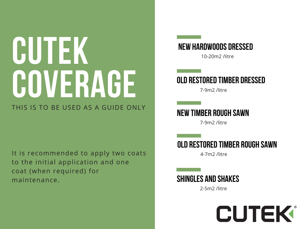 - Coverage is approximately 1 litre of Cutek Wood Stripper per 3m2 of surface area.